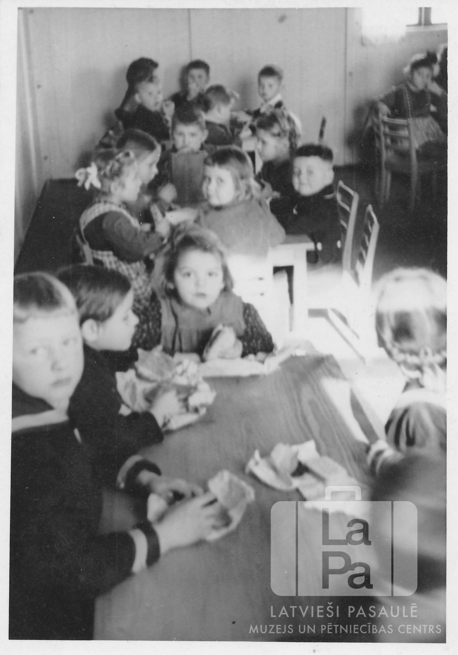 Mazi bērni sēž pie galdiem un ēd sviestmaizes bērnudārzā Lauingenes nometnē (amerikāņu zonā). Bildes vidū – Dagnija Neimane.