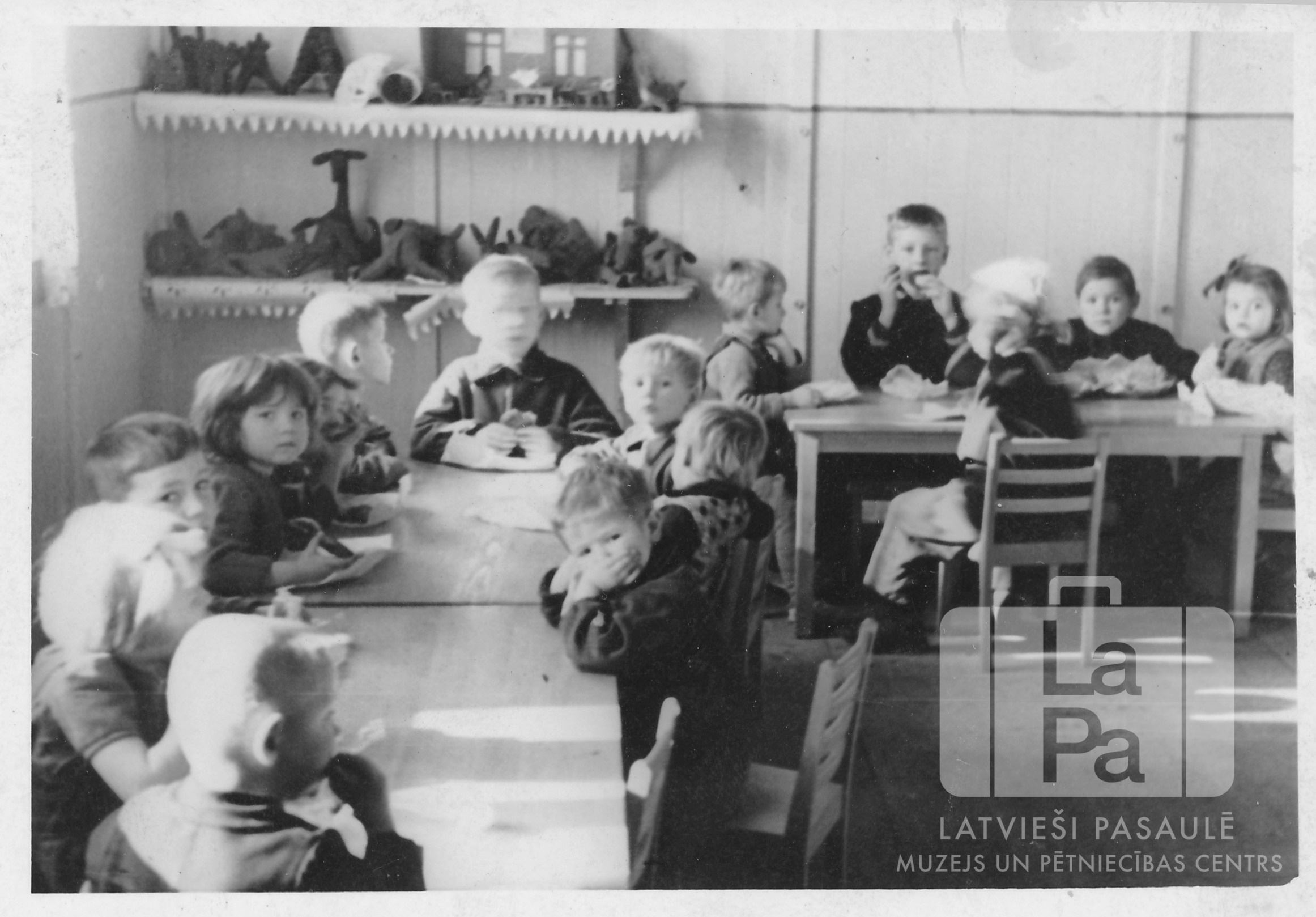 Mazi bērni sēž pie galdiem un ēd sviestmaizes bērnudārzā Lauingenes nometnē (amerikāņu zonā). Aizmugurē pie sienas ir plaukti ar rotaļlietām.