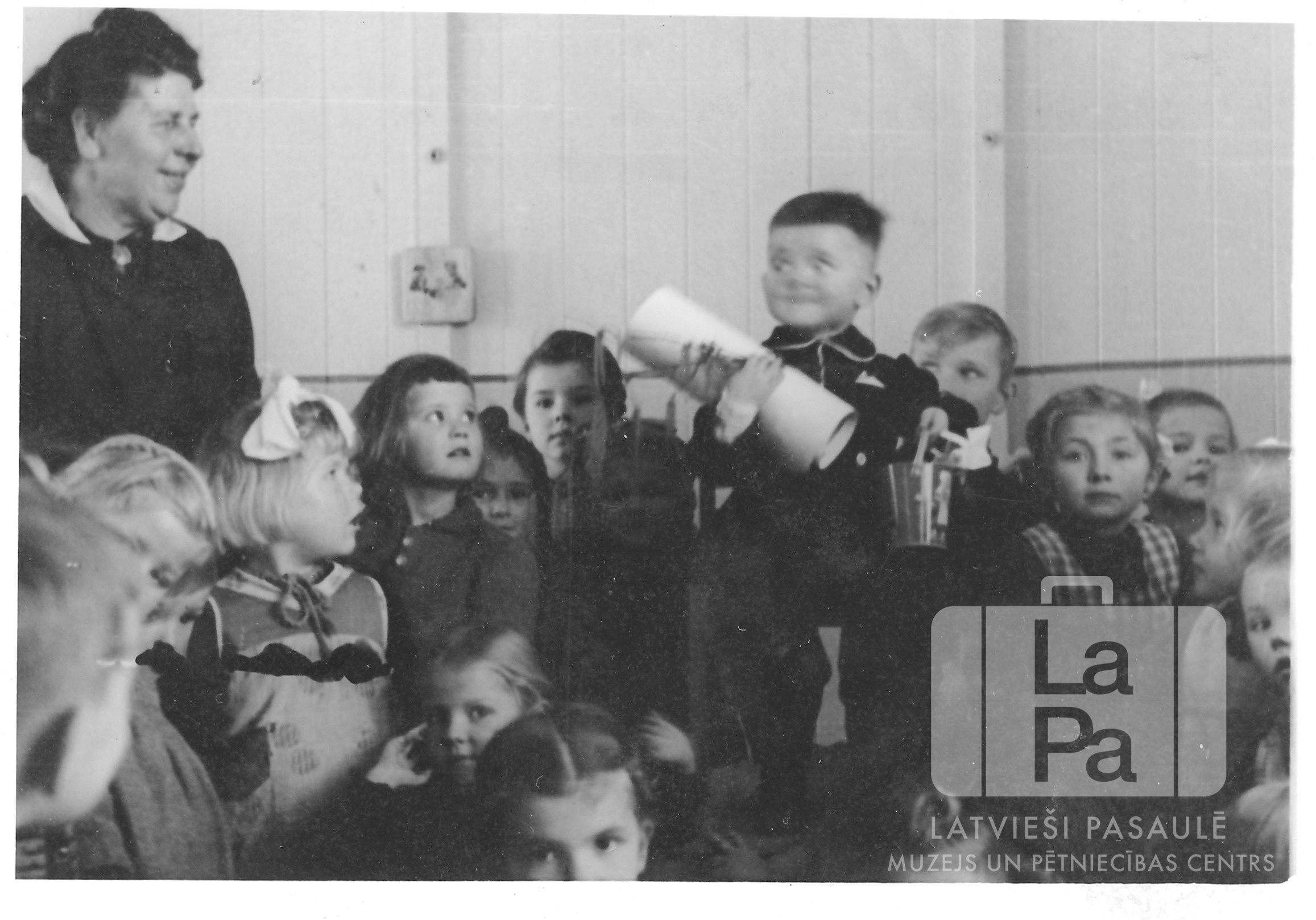 Bērnu grupa ar gaviļnieku centrā dzimšanas dienas svinībās bērnudārzā Lauingenes nometnē (amerikāņu zonā). Zēns vidū tur lielu, ar banti apsietu papīra saini un mazu spainīti.