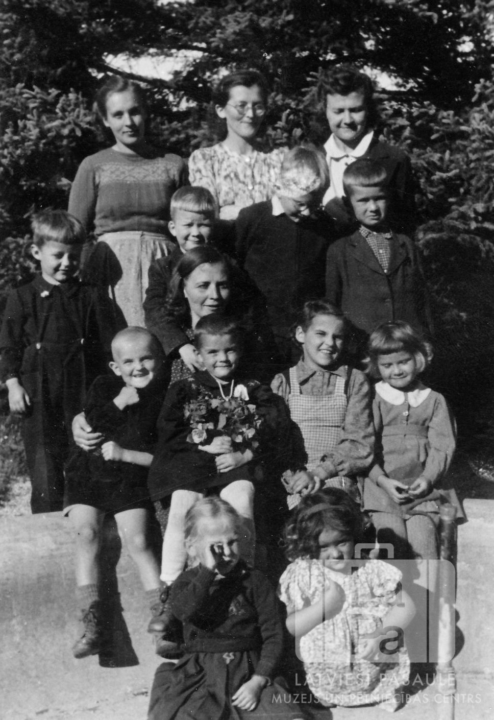 Cilvēku grupa Dagnijas Neimanes dzimšanas dienas svinībās Lauingenes nometnē (amerikāņu zonā). Fonā skujkoki. Otrajā rindā, no kreisās: pirmā Maruta Neimane, otrā Dagnija Neimane (ar puķēm). Aiz Dagnijas Neimanes (starp otro un trešo rindu) – Margarita Šnore. Trešajā rindā, no kreisās: pirmais Valdis Sveķis, otrais Daumants Šnore, trešais Austars Šnore. Ceturtajā rindā, no kreisās: nezināms, Lidija Neimane, Tamāra Sveķe.