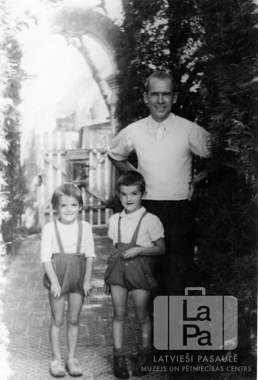 Vīrietis ar divām mazām meitenēm Lauingenes nometnē (amerikāņu zonā). No kreisās: Dagnija Neimane, Maruta Neimane, Andrejs Neimanis. Fonā dzīvžogs un zemi koka vārti.