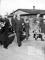 Cilvēku grupa soļo pa Lauingenes nometni (amerikāņu zonā) latviešu luterāņu arhibīskapa vizītes laikā. No kreisās: arhibīskaps Teodors Grīnbergs (ar ziediem rokās) un Lauingenes nometnes priekšnieks V. Poriņš. Poriņam aiz muguras Jānis Platais.