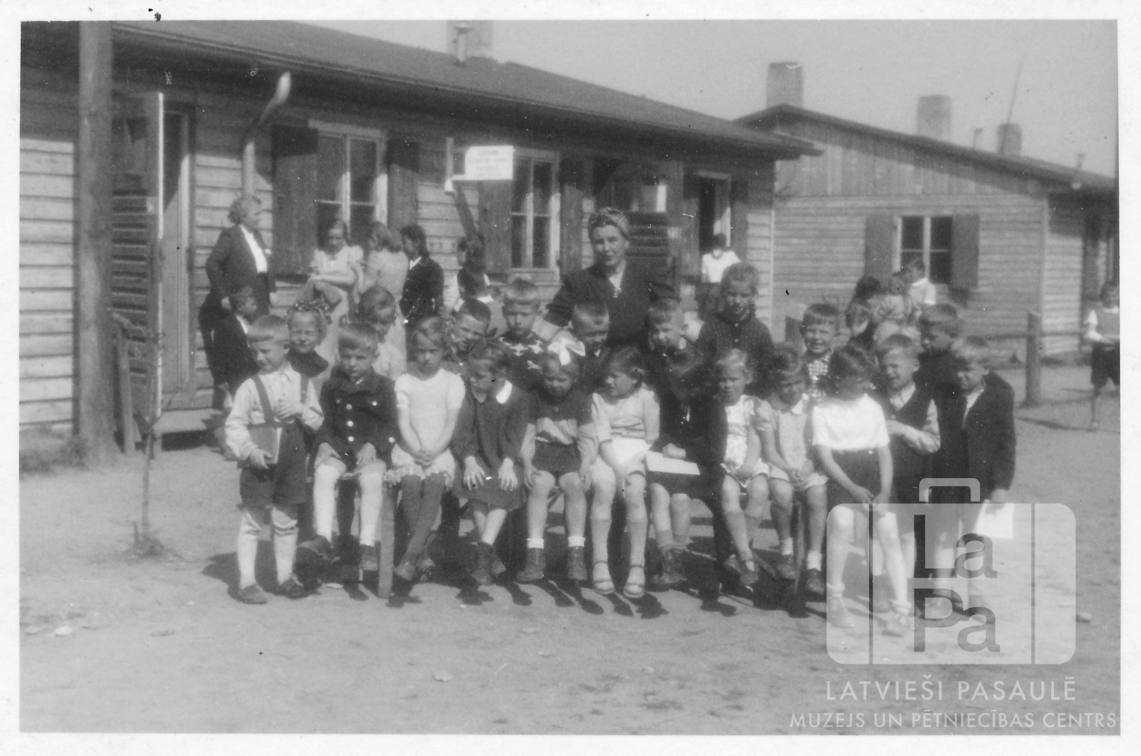 Latviešu skolas pirmā klase ar klases audzinātāju skolas barakas priekšā Haunštetenes nometnē Augsburgā (amerikāņu zonā). Fonā cilvēki pie vienstāvu koka barakām.