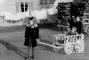 Trīs bērni spēlējas ar ratiem pie sakrautas malkas grēdas Haunštetenes nometnē Augsburgā (amerikāņu zonā). Kreisajā pusē ēka ar pie logiem izkārtu veļu. No kreisās: Dagnija Neimane (velk ratus), ? Rodko (ratos), Ieva Rodko (aiz ratiem).