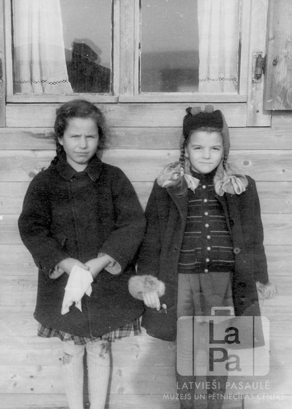 Divas meitenes stāv pie koka barakas loga Haunštetenes nometnē Augsburgā (amerikāņu zonā). No kreisās: Ieva Rodko un Dagnija Neimane.