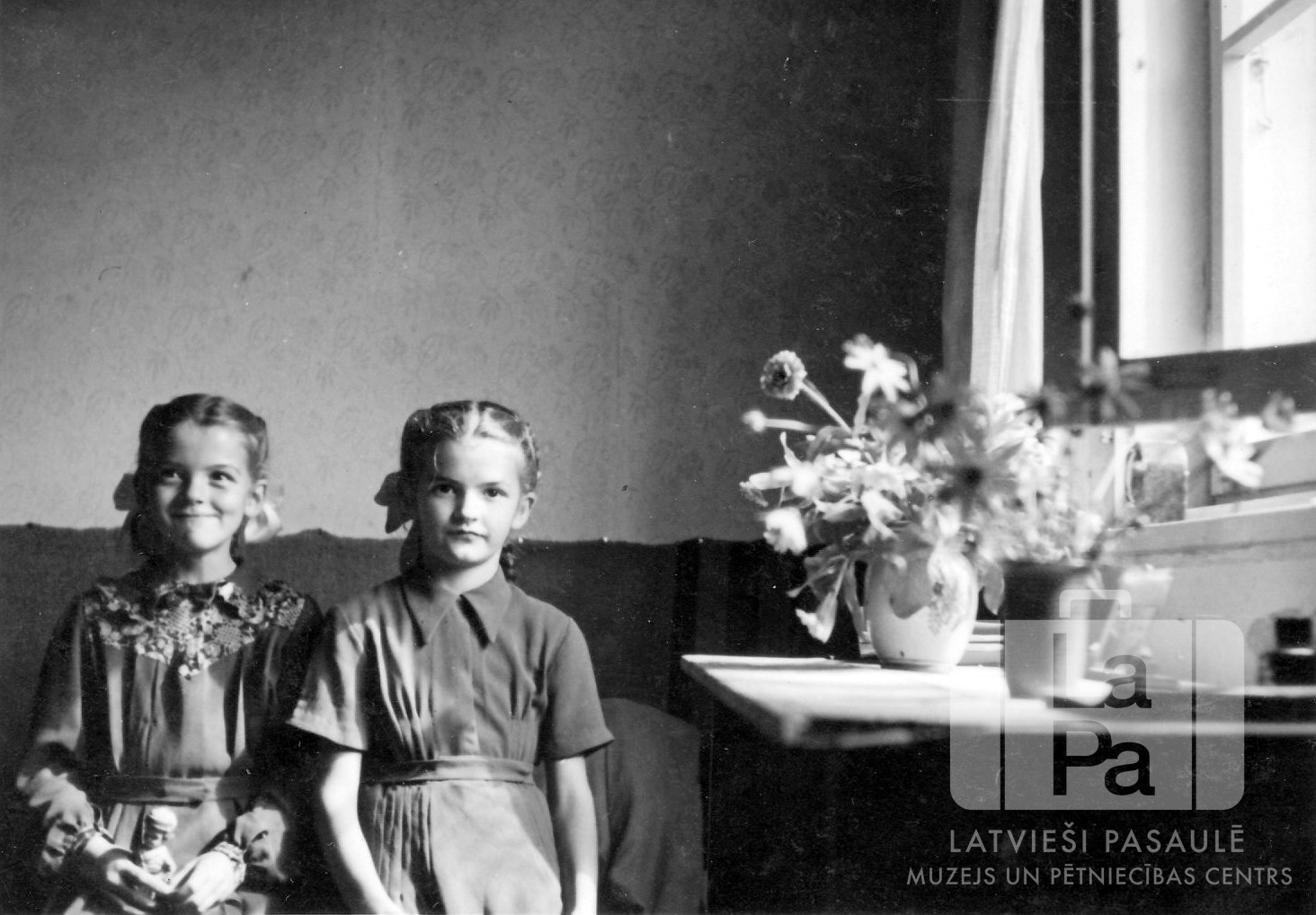 Māsas Neimanes sēž uz gultas malas istabā Haunštetenes nometnē Augsburgā (amerikāņu zonā). Aiz māsām uz sienas piekarināta sega. Labajā pusē pie pavērtā loga vāzēs ir ziedi. No kreisās: Dagnija Neimane un Maruta Neimane.