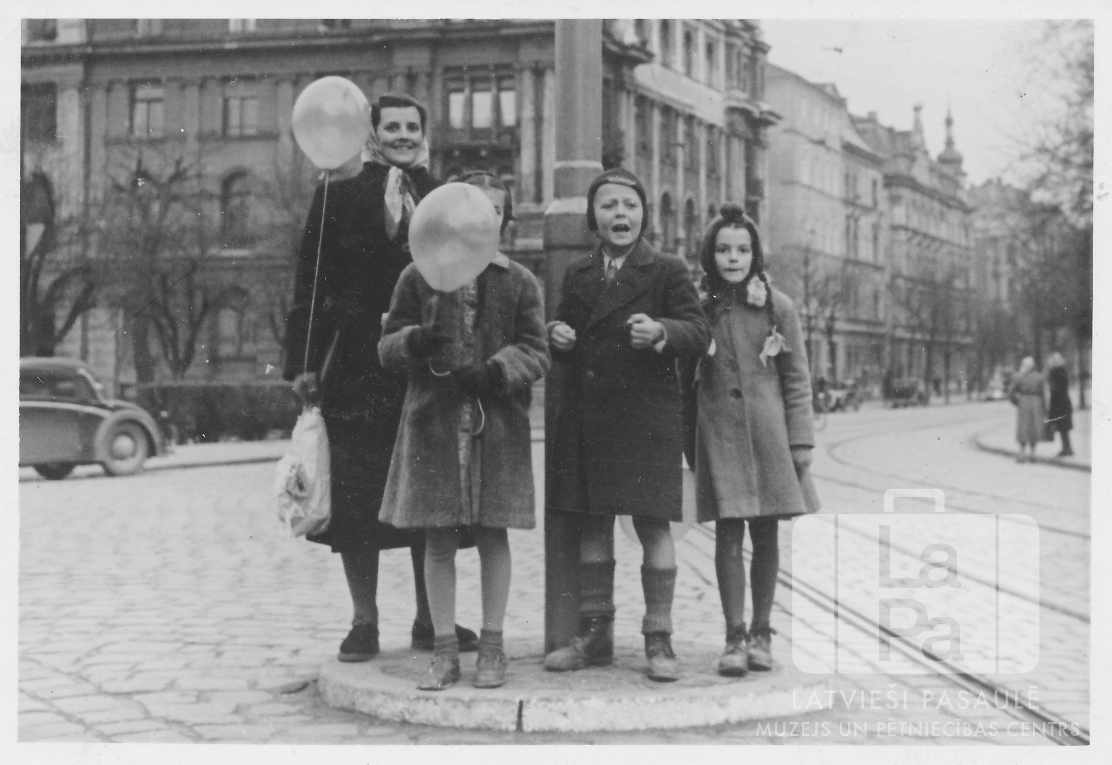 Sieviete ar trīs bērniem no Haunštetenes nometnes Augsburgā (amerikāņu zonā) stāv uz paaugstinājuma bruģētas ielas vidū Minhenē. Sievietei un vienai meitenei rokās ir hēlija baloni. Garām pa ielu iet sliedes. Fonā cilvēki, automašīnas un dzīvojamie nami. No kreisās: Anna Sveķe, Maruta Neimane, Valdis Sveķis, Dagnija Neimane.