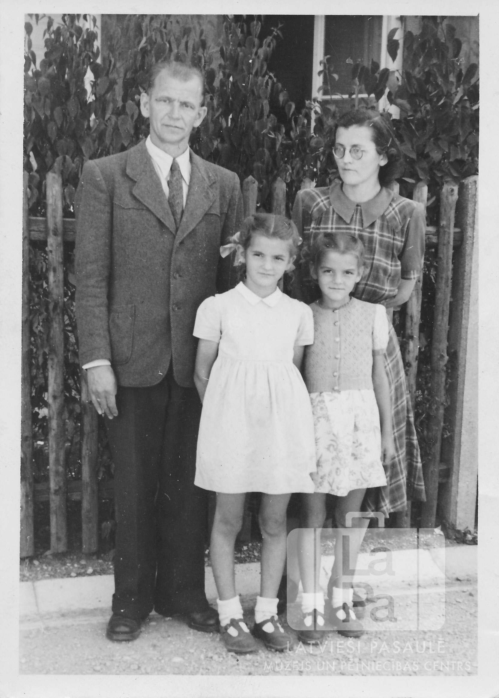 Neimaņu ģimene stāv pie koka žoga Haunštetenes nometnē Augsburgā (amerikāņu zonā). Aiz žoga aug koki un redzams pavērts mājas logs. Priekšā, no kreisās: Maruta Neimane un Dagnija Neimane. Aizmugurē, no kreisās: Alfrēds Neimanis un Lidija Neimane.