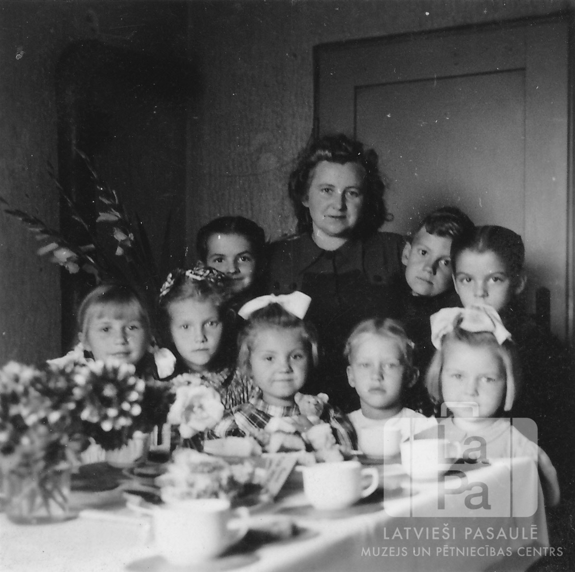 Cilvēku grupa bērna dzimšanas dienas svinībās Haunštetenes nometnē Augsburgā (amerikāņu zonā). Priekšplānā saklāts svētku galds tasēm un ziediem. Aizmugurē, istabas stūrī, arī ir ziedi (gladiolas). Priekšā, trešā no kreisās puses: Laimdota Gleške (ar rotaļu lācīti rokās). Otrajā rindā, no kreisās: Maruta Neimane, autore un dziedātāja Lilija Gleške, Indulis Gleške, Dagnija Neimane.