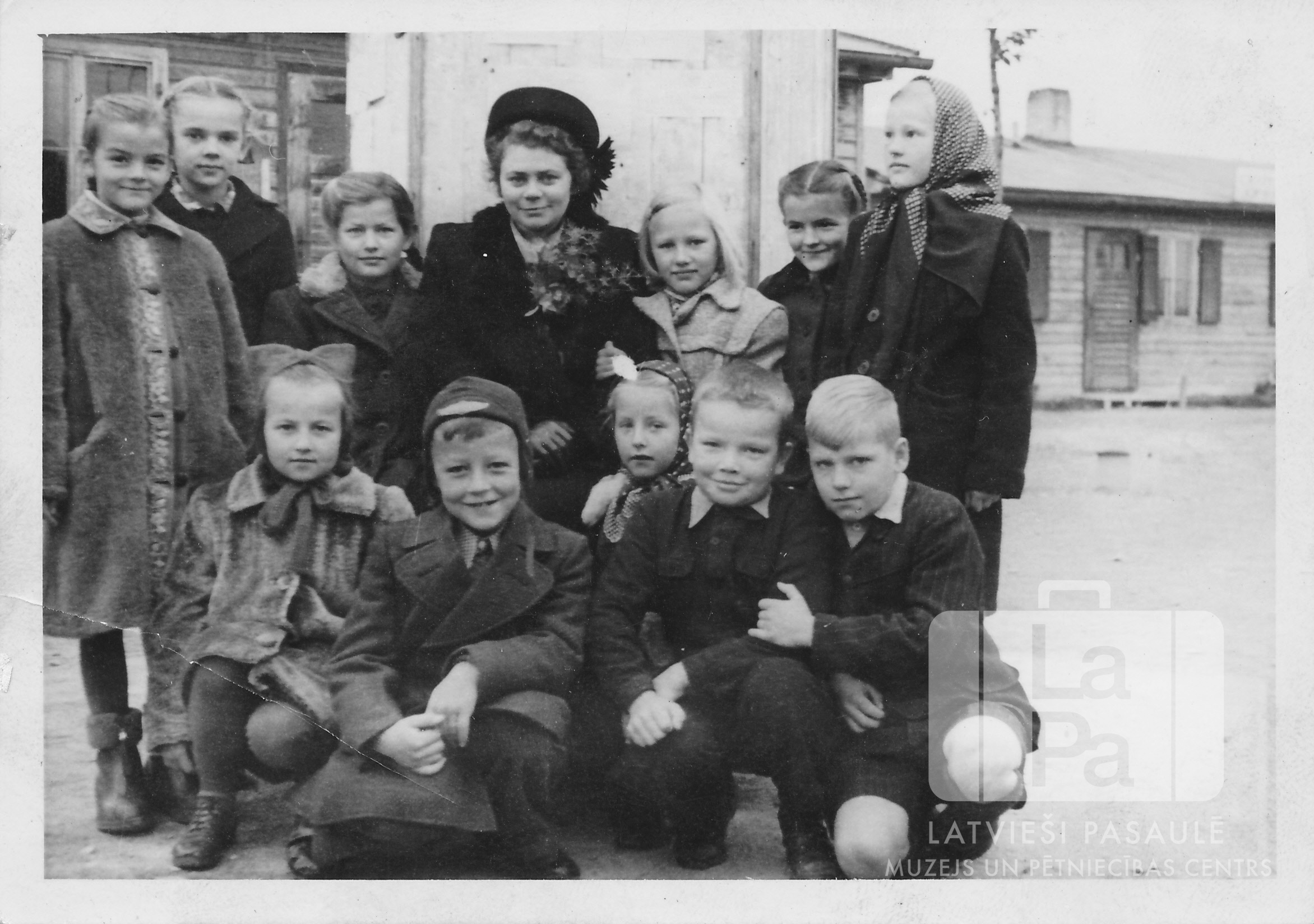 Bērni ar skolotāju Haunštetenes nometnē Augsburgā (amerikāņu zonā). Fonā vienstāvu koka barakas. Priekšā, no kreisās: pirmā Maija Valta, otrais Valdis Sveķis. Aizmugurē, no kreisās: pirmā Dagnija Neimane, ceturtā skolotāja ? Jurševska, sestā Maruta Neimane.