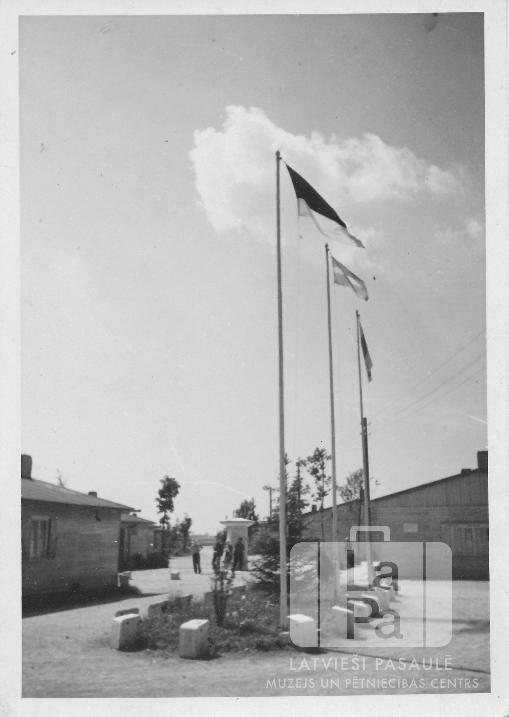 Trīs karogi mastos laukumā Haunštetenes nometnē Augsburgā (amerikāņu zonā). Vidū – Latvijas karogs. Apkārt redzamas vienstāvu koka barakas.