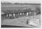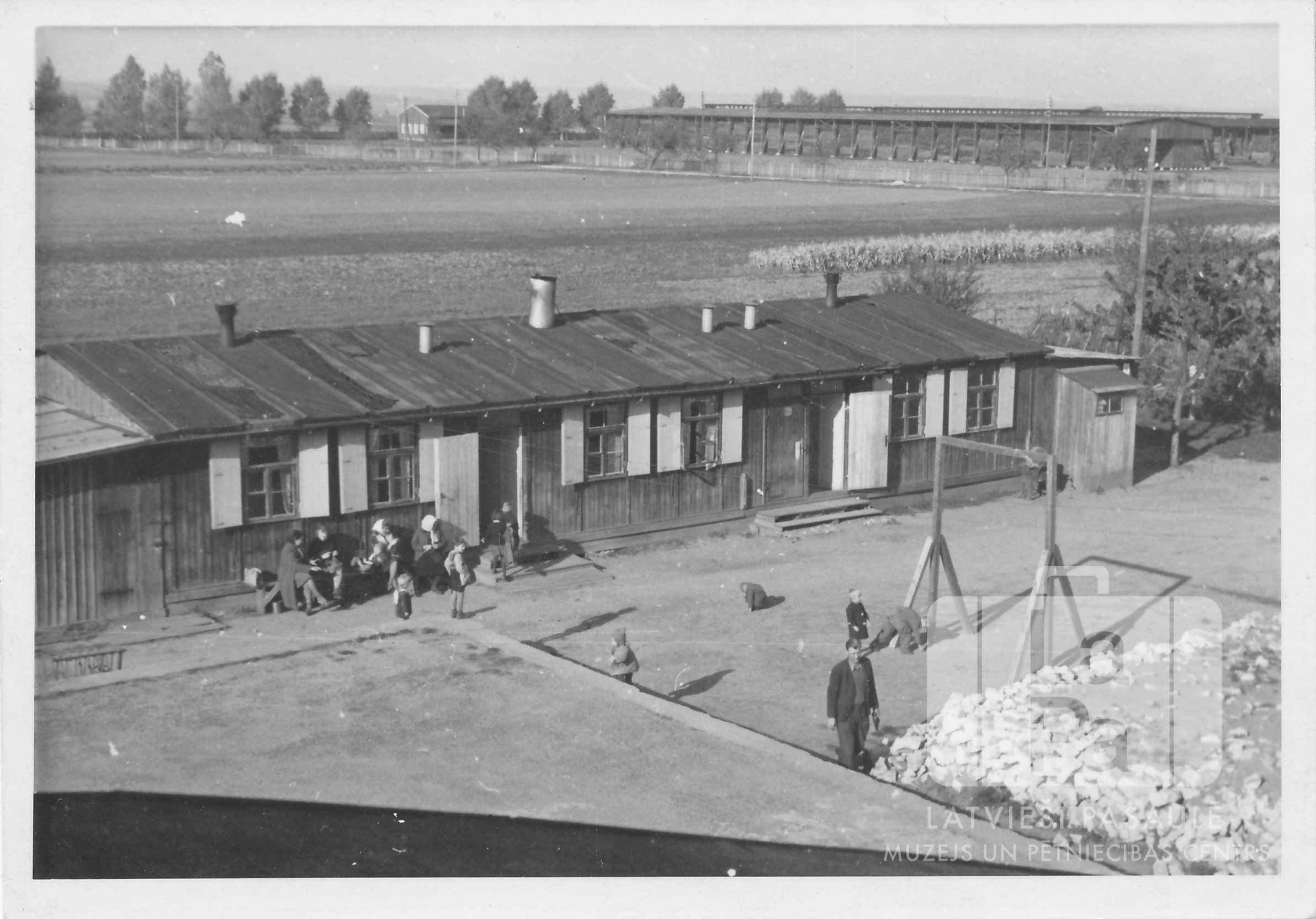 Barakas un sporta laukums Haunštetenes nometnē Augsburgā (amerikāņu zonā). Nometnes vidū koka šūpoļu konstrukcija. Laukumā pastaigājas cilvēki. Aiz barakām klajš lauksaimniecības lauks.