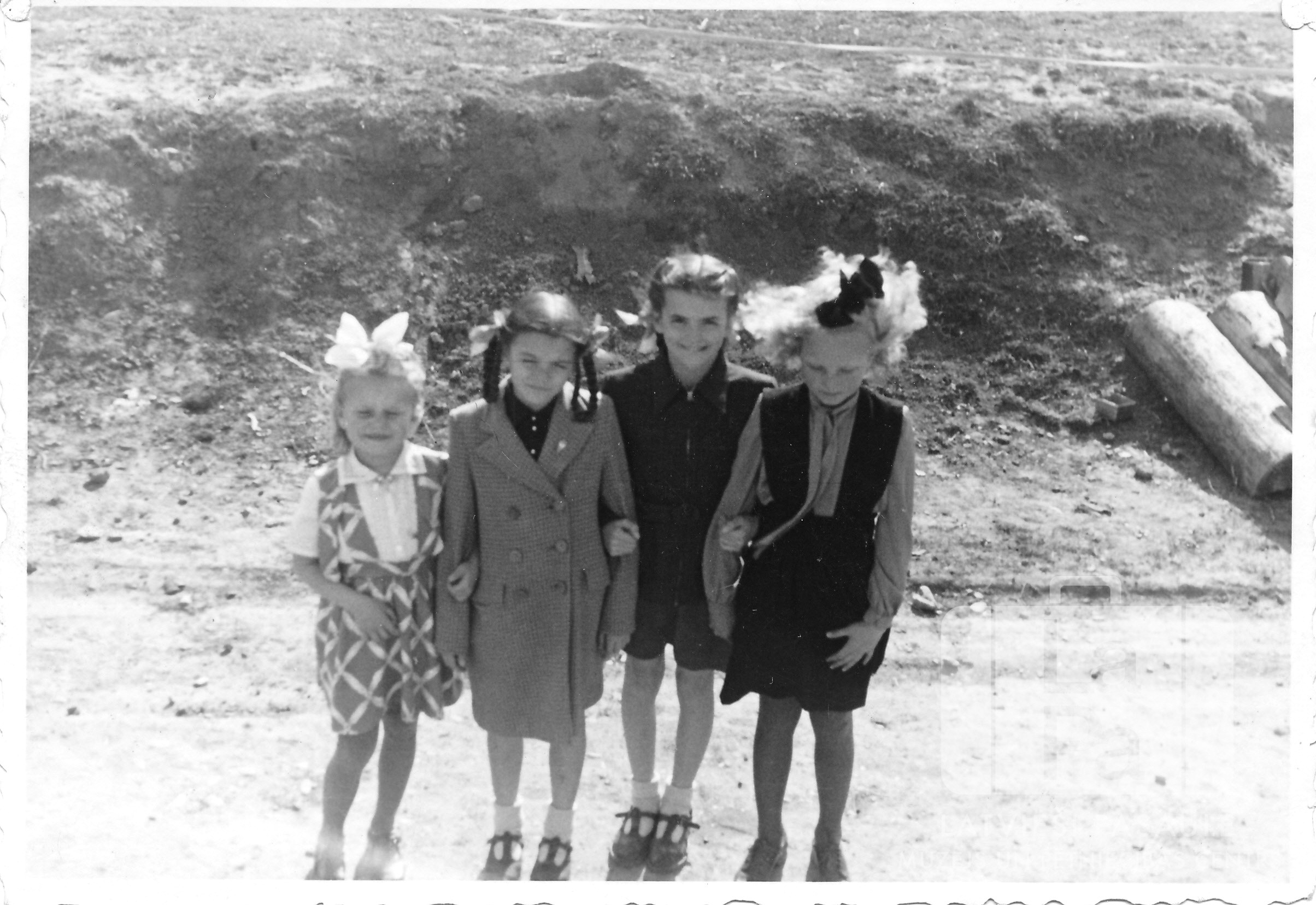 Četras meitenes Haunštetenes nometnē Augsburgā (amerikāņu zonā) 1950. gada Lieldienu rītā. No kreisās: Laima Stede, Dagnija Neimane, Maruta Neimane, Ērika Trepše. Foto autors: Anna Svaķe.