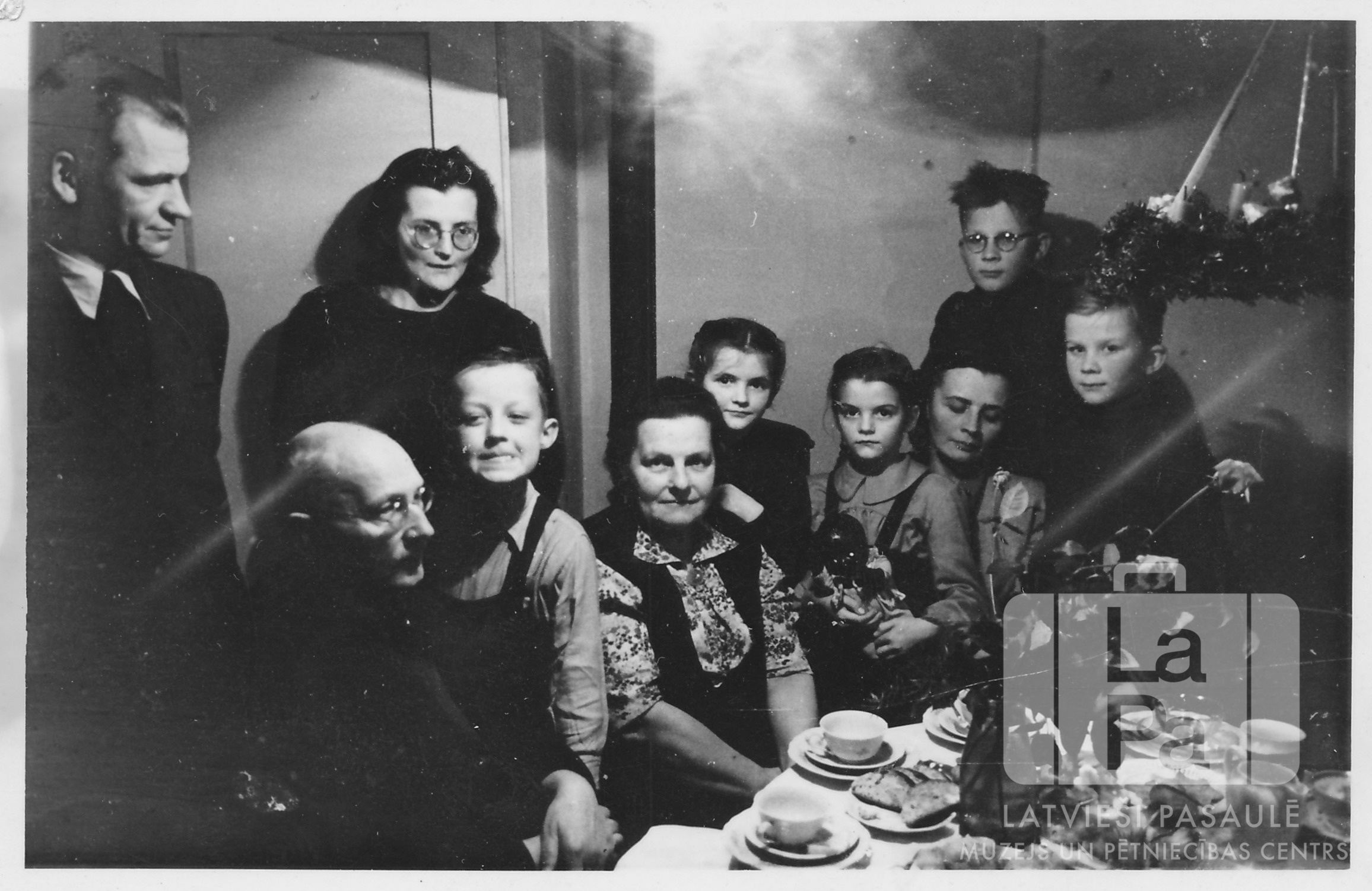 Cilvēku grupa sēž istabā pie klāta galda Haunštetenes nometnē Augsburgā (amerikāņu zonā). Uz galda vāzē ir rozes. Priekšā, no kreisās: pulkvedis Pēteris Silenieks, Valdis Sveķis, Alīse Sileniece, Maruta Neimane un Dagnija Neimane, Margarita Šnore un Daumants Šnore. Aizmugurē stāv, no kreisās Alfrēds Neimanis, Lidija Neimane un Austars Šnore.