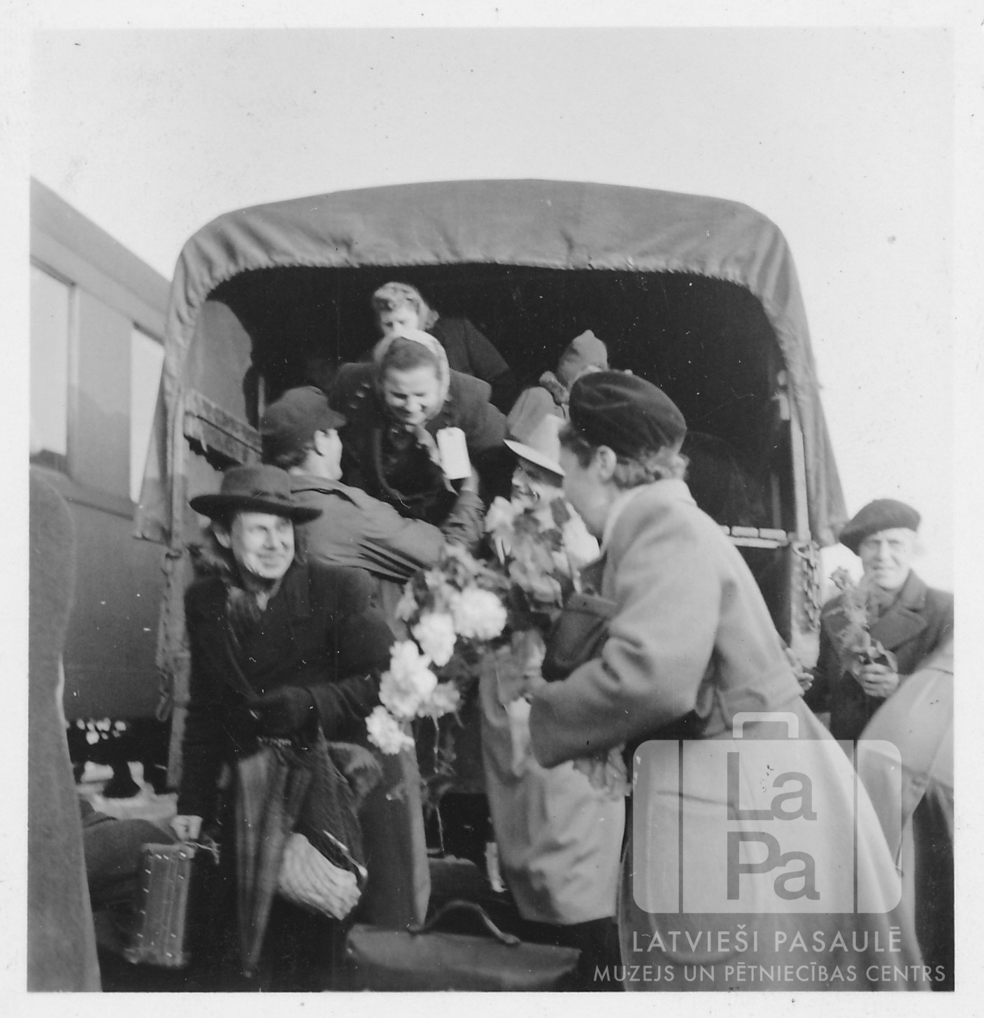 Cilvēki kāpj ārā no smagās mašīnas dzelzceļa stacijā Augsburgā (amerikāņu zonā) pirms došanās uz Brēmerhāfenu. Kreisajā pusē redzams vilciens. Otrā no augšas: Alīse Sileniece.