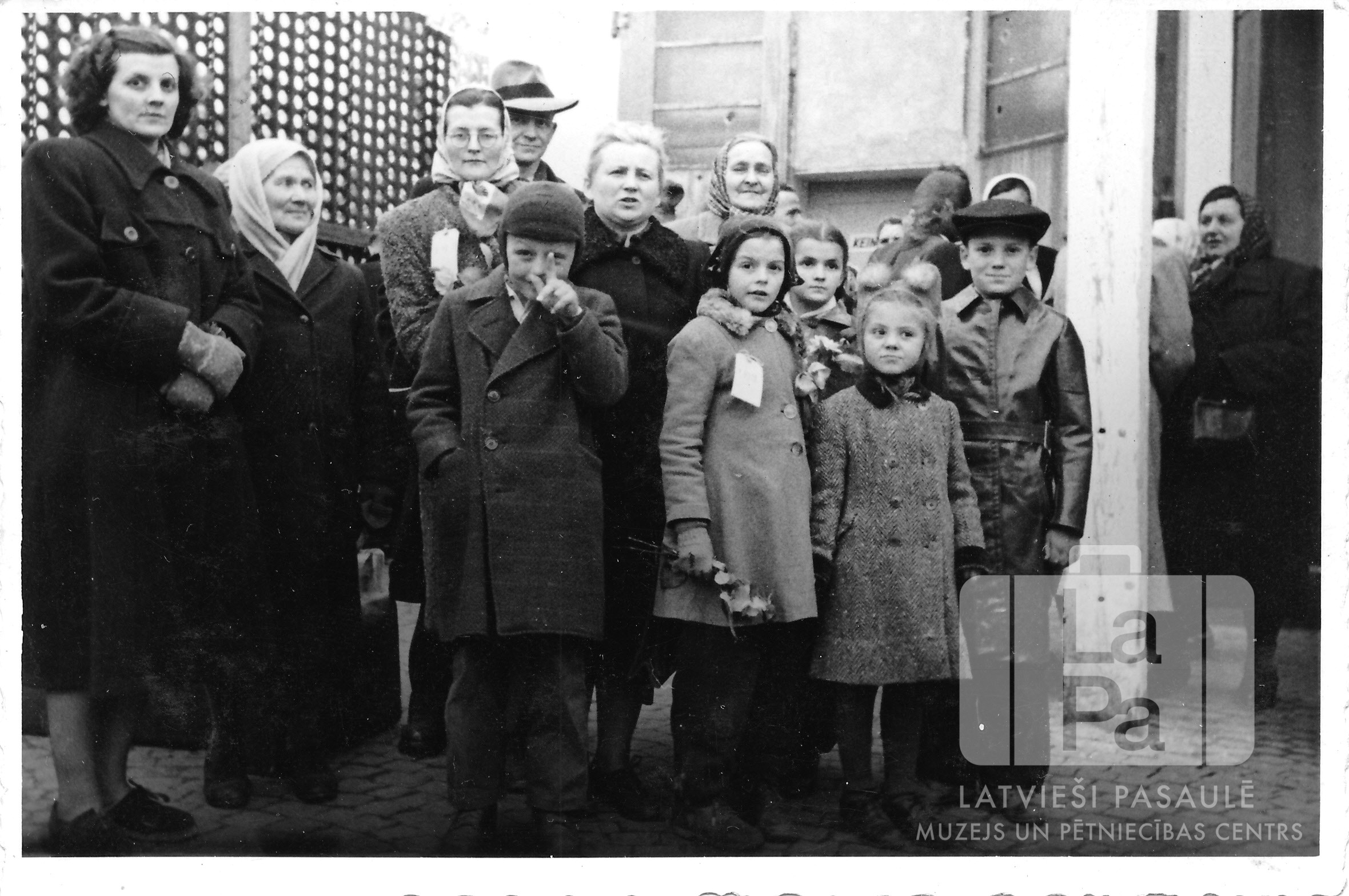 CIlvēku grupa stāv Haunštetenes nometnē Augsburgā (amerikāņu zonā), Neimaņu ģimenei izbraucot uz ASV ar kara transporta kuģi "General C. C. Ballou". Izceļotājiem pie krūtīm tradicionālās izceļošanas birkas. Aizmugurē kreisajā pusē metāla režģu siena, fonā labajā pusē cilvēki. Priekšā, no kreisās: Valdis Sveķis, Dagnija Neimane, Maruta Neimane, Laimdota Gleške un Indulis Gleške. Aizmugurē, no kreisās: Anna Sveķe, nezināms, Lidija Neimane, Alfrēds Neimanis, Lilija Gleške, nezināms.