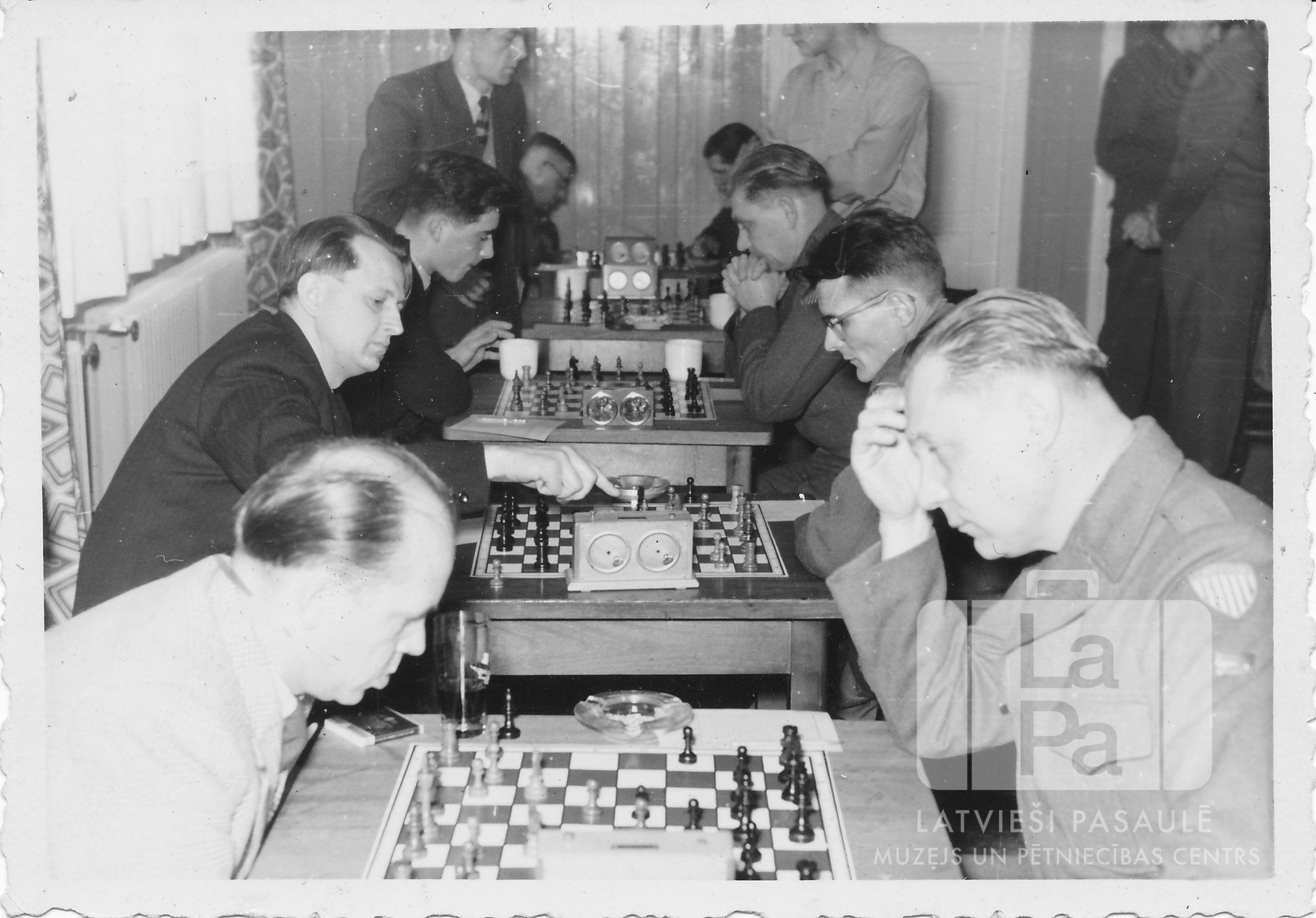 Vīrieši sēž pie šaha galdiem Viestura rotā Štutgartē (amerikāņu zonā). Otrais no labās puses: Hermanis Bištēviņš.