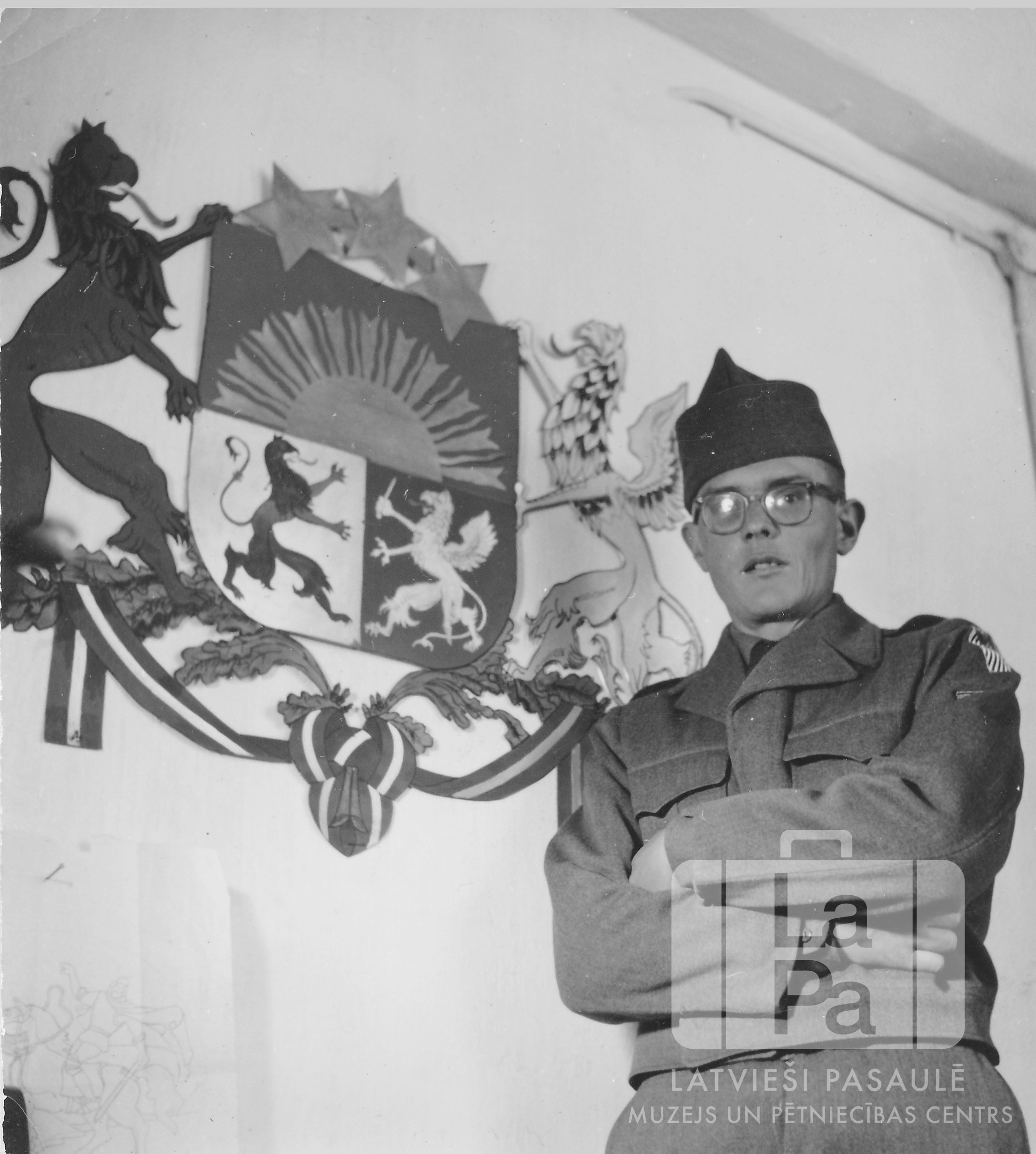Hermanis Bištēviņš formastērpā pie Latvijas valsts ģerboņa Viestura rotā Štutgartē (amerikāņu zonā).