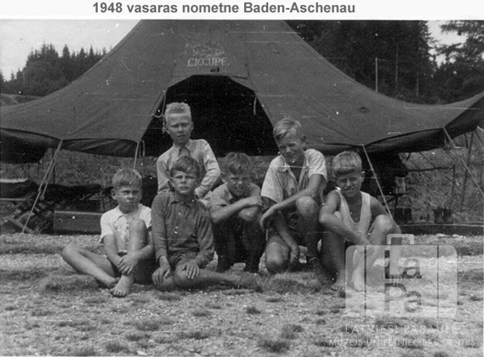 Seši zēni telts priekšā latviešu vasaras nometnē "Baden-Aschenau" reģionā bērniem no Haunštetenes nometnes Augsburgā (amerikāņu zonā). Grupas aizmugurē: Dimitrijs Pešudovs. Uz augšējās malas ir uzdrukāts teksts: "1948 vasaras nometne Baden-Aschenau".