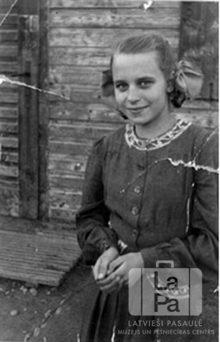 Astrīda Paegle stāv koka ēkas priekšā Haunštetenes nometnē Augsburgā (amerikāņu zonā). Matos Astrīdai ir sapītas lentes. Par šo gadījumu Dimitrijs Pešudovs atceras: "Astrīda Paegle, Dima klases biedrene, pie sava dzīvokļa durvīm Augsburgas nometnē."