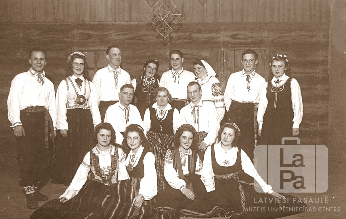 Tautas deju grupas dalībnieki tautastērpos Centrālajā nometnē Vircburgā (amerikāņu zonā). Aizmugurē, no kreisās: otrā Dzidra Lietuvietis (pr. Ziedonis), astotā Vija Dzene. Vidū grupas vadītāji Dzelmes.