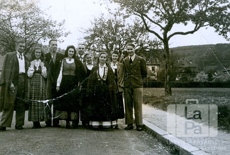 Tautas deju grupas dalībnieki tautastērpos no Centrālās nometnes Vircburgā (amerikāņu zonā) izbraukumā uz citu nometni. No kreisās: otrā Dzidra Lietuvietis (pr. Ziedonis), septītā grupas vadītāja Elvīra Dzelme.