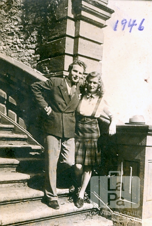 Divi jaunieši no Vircburgas Centrālās nometnes satiekas uz Vircburgas pils kāpnēm (amerikāņu zonā). No kreisās: Valentīns Ziedonis un Dzidra Lietuvietis (pr. Ziedonis). Uz fotogrāfijas ar zilu krāsu rakstīts: "1946".