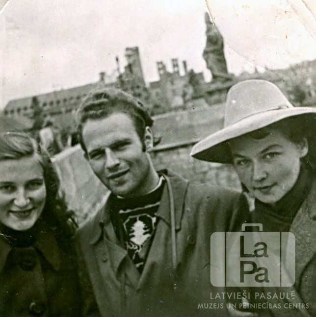 Trīs jauni cilvēki uz akmens tilta Vircburgā (amerikāņu zonā). Fonā tilta statujas un sabombardētas pilsētas skats. No kreisās: Dzidra Ziedonis (dz. Lietuvietis), Valentīns Ziedonis un pianiste Tamāra Ziedone-Bīskapa.