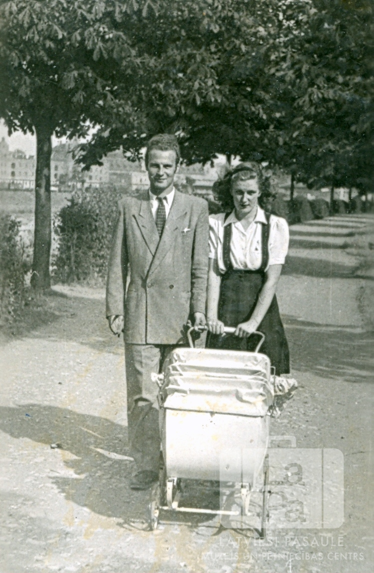 Ziedoņu ģimenes pāris ar bērnu ratiem pastaigas laikā gar Mainas upi Vircburgā (amerikāņu zonā) 1947. gada vasarā. Fonā koku un krūmu rinda. No kreisās: Valentīns Ziedonis (Dzidra Ziedonis (dz. Lietuvietis).