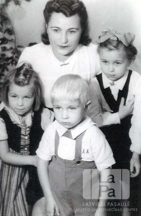 Akmentiņu ģimene svinīgos tērpos Altgarges nometnē (angļu zonā). Priekšā, no kreisās: Dzintra Akmentiņa (pr. Flynn), Jānis Akmentiņš. Aizmugurē, no kreisās: Helēne Akmentiņa, Skaidrīte Akmentiņa. Par šo gadījumu Dzidra Flynn (dz. Akmentiņa) atceras: "Otrā pasaules kaŗa beigās daudz jaunas mātes ar maziem bērniem nonāca Vācijā un vēlāk DP nometnēs. Šodien, domājot par to, jābrīnās, kā gan šīs jaunās latvietes to visu varēja pārdzīvot un tomēr uzaudzināt savas ģimenes. Latvietes tomēr ir no sīksta koka."