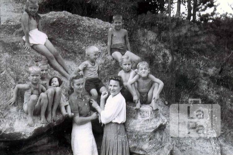 Divas sievietes ar bērniem uz nogāzes Altgargē (angļu zonā) 1946. gada vasarā. Priekšā, otrā no kreisās: Helēne Akmentiņa. Otrajā rindā, no kreisās: otrā Skaidrīte Akmentiņa (ar lelli), trešais Jānis Akmentiņš. ceturtā Dzintra Akmentiņa (pr. Flynn). Par šo gadījumu Dzidra Flynn (dz. Akmentiņa) atceras: "Priecājāmies upītes malā, lai gan peldēties nevarējām, jo bija bailes no zušiem, kas bija ļoti daudz upītē. Bet tie gan bija garšīgi, sacepti uz maizes šķēles. Nometnē divas ģimenes dzīvojām vienā istabā. Neatceros, kā mēs, septiņi bērni, sadzīvojām un kā mūsu mātes mūs, draiskuļus, novaldīja. Laimīgi vai nelaimīgi, drīz mēs dabūjām paši savu mazu istabiņu, jo Skaidrīte saslima ar difterītu un tika ievietota slimnīcā. Mēs tikām atdalīti no citiem bērniem, lai gan nometnē saslima vairāki."