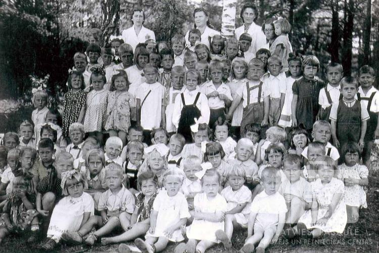 Bērnudārza bērni ar skolotājām svinīgos tērpos Altgarges nometnē (angļu zonā) 1946. gada vasarā. Fonā mežs.