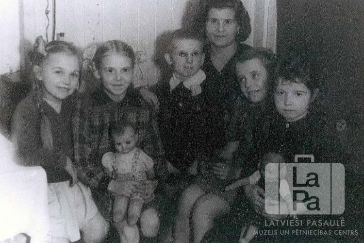Sieviete ar bērniem Altgarges nometnē (angļu zonā). Divām meitenēm rokās ir lelles. Par šo gadījumu Dzidra Flynn (dz. Akmentiņa) atceras: "Lelles visām nebija, tāpēc spēlējāmies kopā ar draudzenēm."