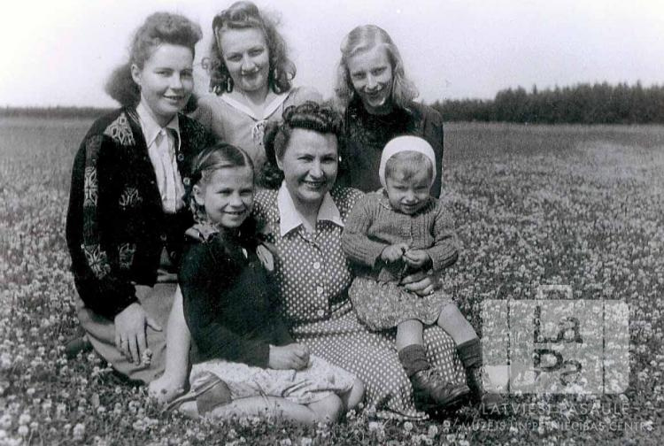 Sievietes ar bērniem sēž ziedoša āboliņa pļavā Altgargē (angļu zonā). Aiz pļavas stiepjas mežs. Priekšā, no kreisās: pirmā Skaidrīte Akmentiņa, otrā Helēne Akmentiņa.