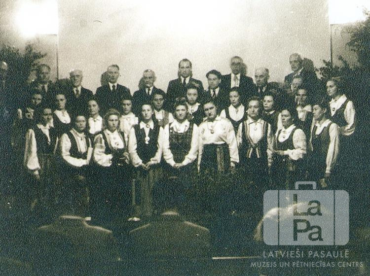 Latviešu jauktais koris tautastērpos un uzvalkos uz skatuves koncerta laikā Dedelstorfas nometnē (angļu zonā) 1949. gada vasarā. Priekšā skatītāju muguras.