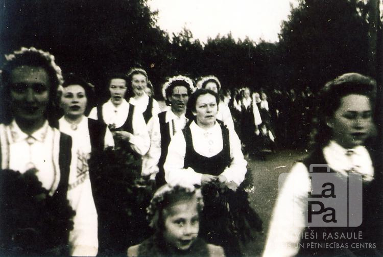 Sievietes tautastērpos un ar vainagiem galvās Dedelstorfas nometnē. Fonā koki. Par šo gadījumu Dzidra Flynn (dz. Akmentiņa) atceras: "Dēdelsdorfa DP nometnes latviešu jauktā koŗa koristes iet uz Līgo vakara svinībām."
