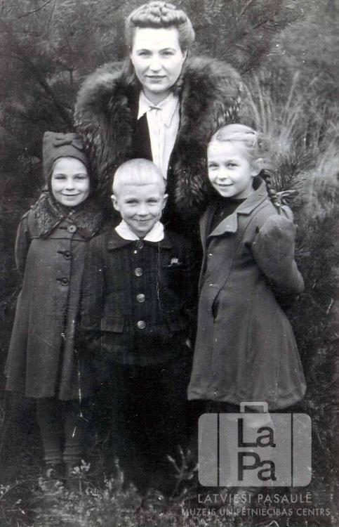 Akmentiņu ģimene svinīgās drēbēs Dīpholcas nometnē (angļu zonā) 1949. gada vasarā. Sievietes mētelim ir kažokādas apkakle. Priekšā, no kreisās: Dzintra Akmentiņa (pr. Flynn), Jānis Akmentiņš, Skaidrīte Akmentiņa. Azmugurē Helēne Akmentiņa.