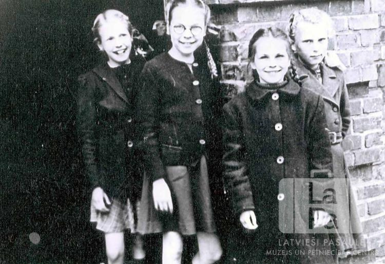 Četras meitenes – nometnes draudzenes – pie ķieģeļu ēkas stūra Dīpholcas nometnē (angļu zonā).