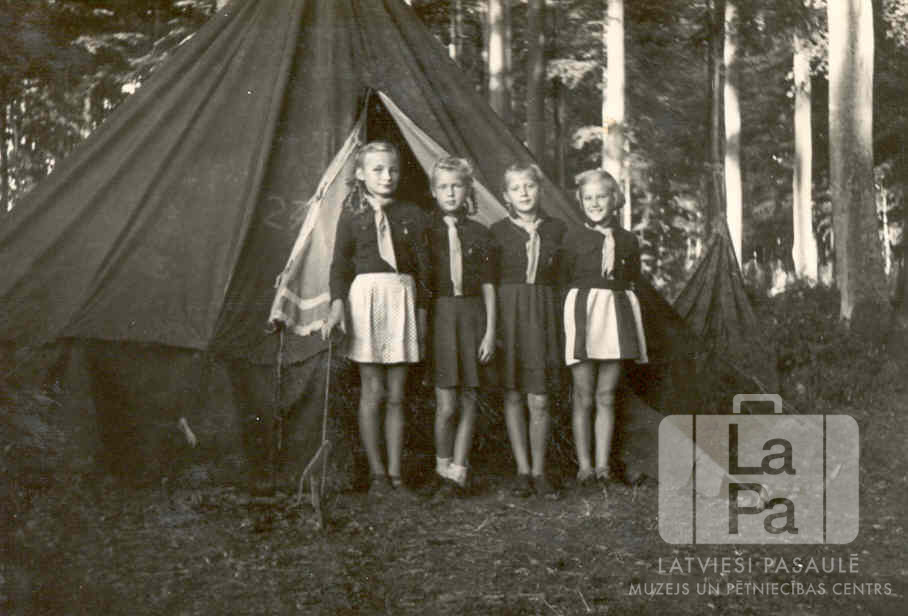Liepavota 3. gaidu vienības četras guntiņas no Mēsenes nometnes Lībekā (angļu zonā) pie telts savā nometnē meža vidū. Ceturtā no kreisās: Vaida Grienvalde (Samoviča).