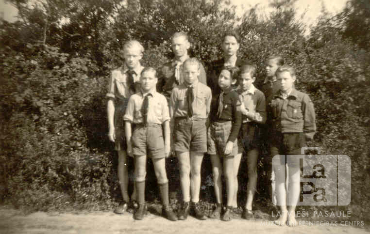 Burtnieku 16. skautu vienības skautu kopa puiši un zēni formastērpos Lībekā (angļu zonā) 1947. gada vasarā. Aizmugurē, no kreisās: pirmais Vitolds Vītols, trešais – latviešu skautu priekšnieks, vadītājs Aleksandrs Raiskums.