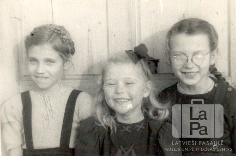 Trīs meitenes no Špakenbergas nometnes Gēsthahtā (angļu zonā) ceturtās mājas 1948. gada vasarā. Otrā no kreisās: Astrīda Pankare. Par šo gadījumu Edgars Zariņš jun. atceras: "Meklējot – ja atrada vienu, tad tur bija citas divas."