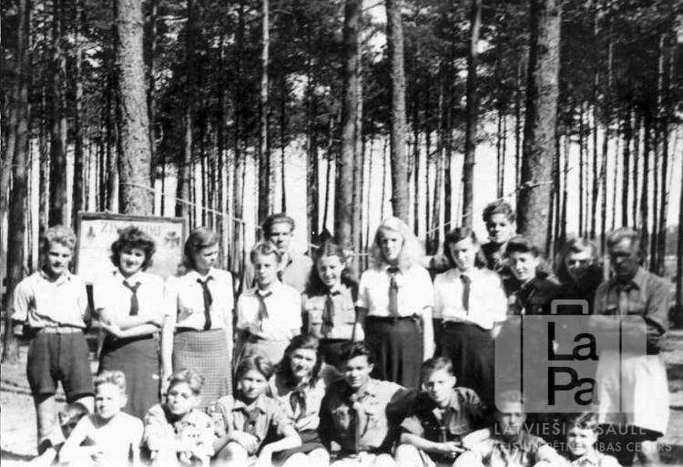 Gaidas un skauti no Skrundas 54. gaidu un 19. skautu vienības mežā starp Valkas (angļu zonā) un Fišbahas nometnēm pie Nirnbergas. Puiši un metenes ir ģērbušies formastērpos.
