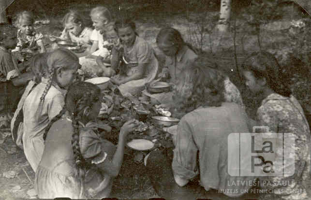 Meiteņu grupa no Valkas nometnes Nirnbergā (amerikāņu zonā) sēž ap zemu galdu mežā 1948. gadā. Uz galda ir redzami šķīvji un ēdiens.