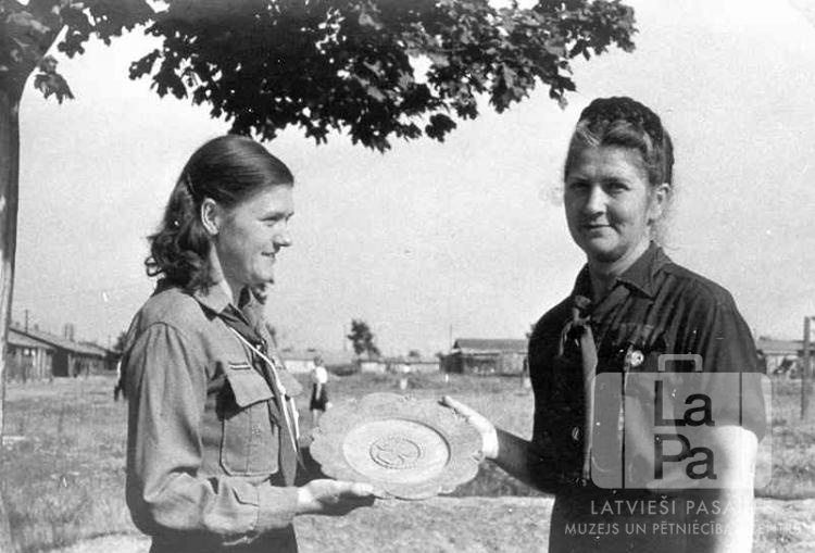 Divas Skrundas 54. gaidu vienības vadītājas ar izcīnīto balvu – šķīvi – Valkas nometnē Nirnbergā (amerikāņu zonā). Aiz sievietēm laukums; gar tā malām ir redzamas vienstāvu koka ēkas. No kreisās: gaidu vadītājas E. Čanka un E. Lubava.