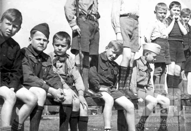 Skrundas 19. skautu vienības mazskautu grupa sēž rindā uz sola Valkas nometnē Nirnbergā (amerikāņu zonā).