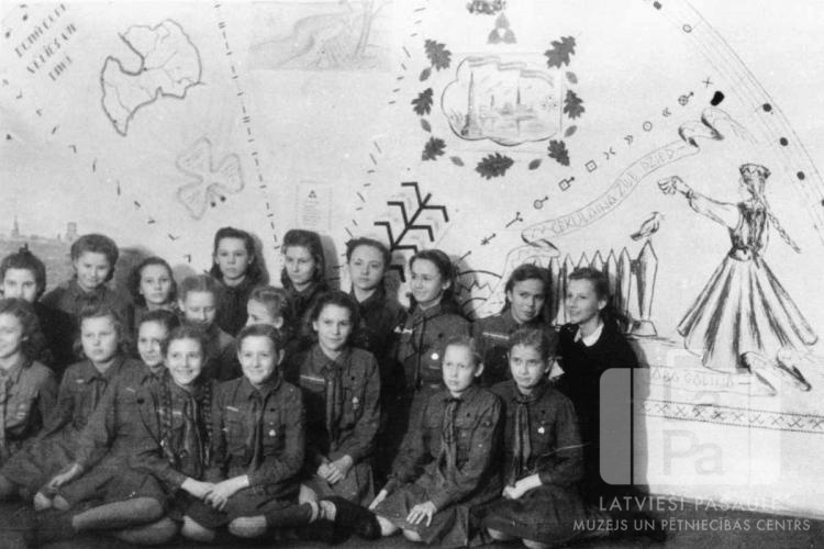 Ventas 62. gaidu vienība sēž uz grīdas Veclārā (amerikāņu zonā). Aiz meitenēm mītnes siena, izdekorēta ar zīmējumiem un rakstiem – rakstaina josta, tautumeita, Latvijas karte ar iezīmētām upēm.