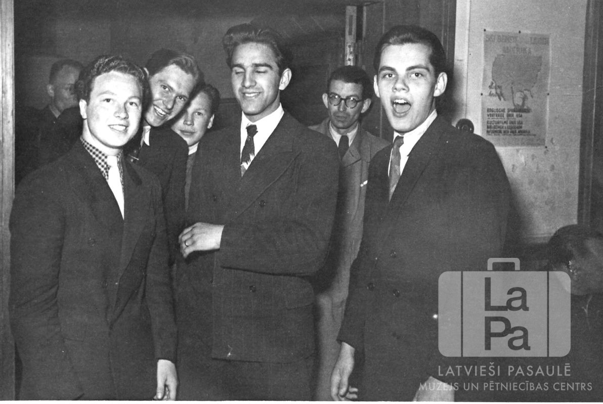 Jauni vīrieši uzvalkos Vecgada svinībās Ventorfas nometnē (angļu zonā). Labajā pusē pie sienas plakāts. Priekšplānā, no kreisās: Ojārs Āboliņš ("Melnais"), Harijs Zikmanis un Edgars Zariņš jun. Otrajā rindā, no kreisās: Zigurds Lieljuris, "Pikalo" Arnis Skangalis, nezināms. Foto autors: Edgars Zariņš jun.