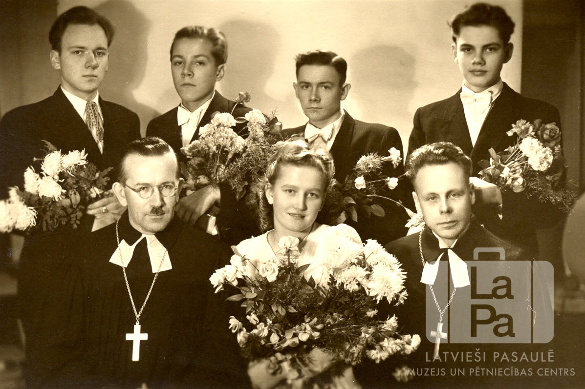 Iesvētamie ar puķēm rokās, pirmā rindā sēž divi mācītāji ar meiteni pa vidu, aizmugurē stāv četri puiši uzvalkos