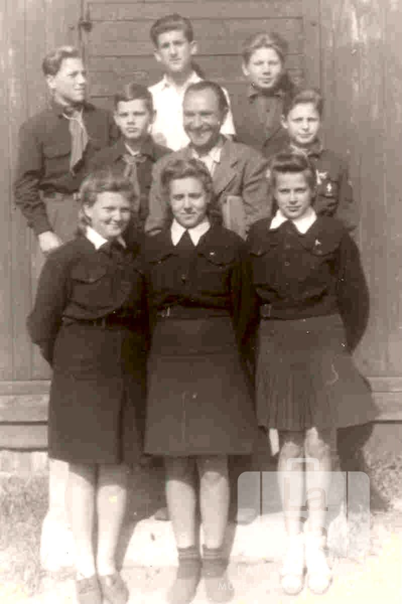 Astoņi jaunieši – 7. klases absolventi – ar klases audzinātāju Vēdeles nometnē (angļu zonā). Pirmajā rindā, no kreisās: I. Labēja, V. Skubiņa un Ilga Pinne. Otrajā rindā, no kreisās: Edgars Zariņš jun., nezināms (klases audzinātājs) un Andris Cīrulis. Trešajā rindā, no kreisās: J. Verners, Vilnis "vilks" Kilēvics un Z. Sirmais.