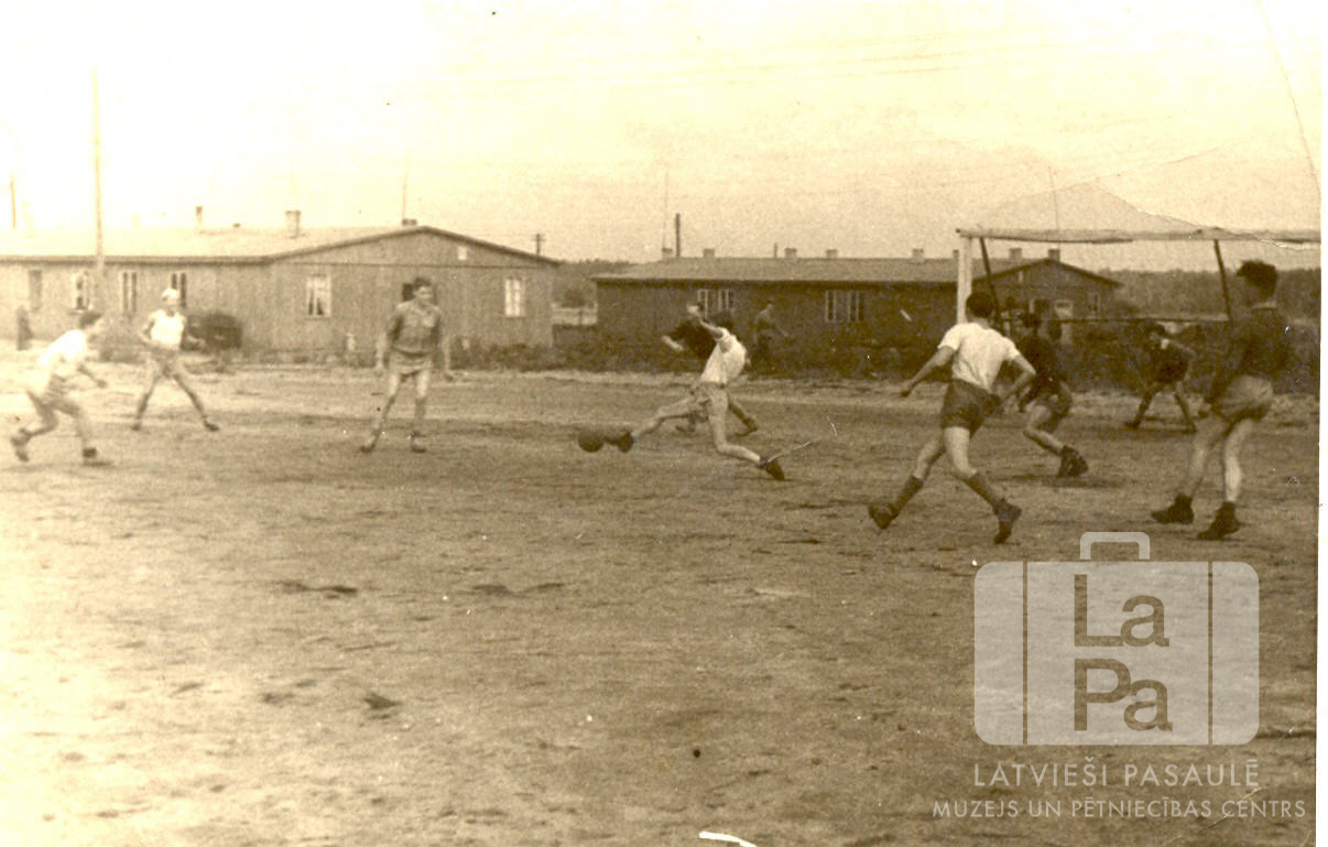 Jaunieši spēlē futbolu laukumā Vēdeles nometnē (angļu zonā). Fonā vienstāvu koka barakas.